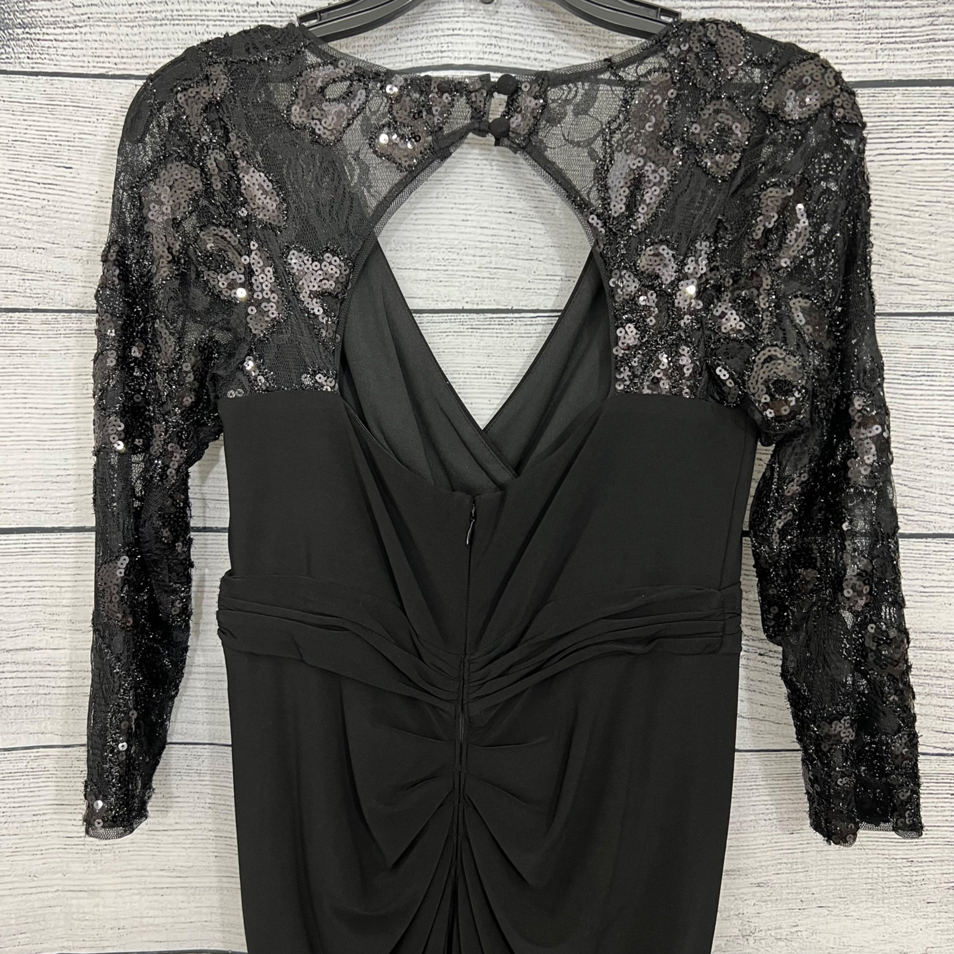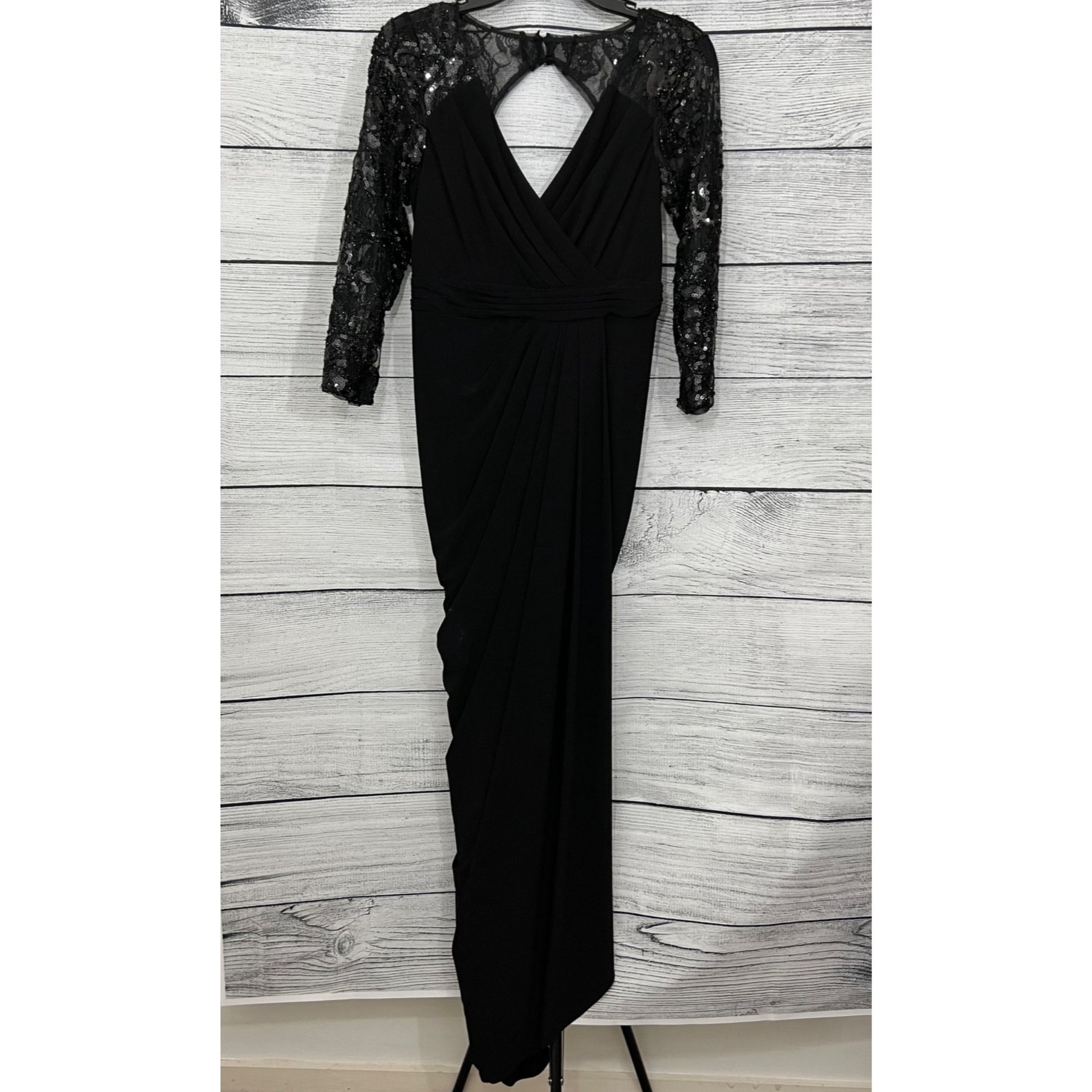 Adrianna Papell Black Evening Gown With Sequin Lace Sleeves & Keyhole Back, Size 4