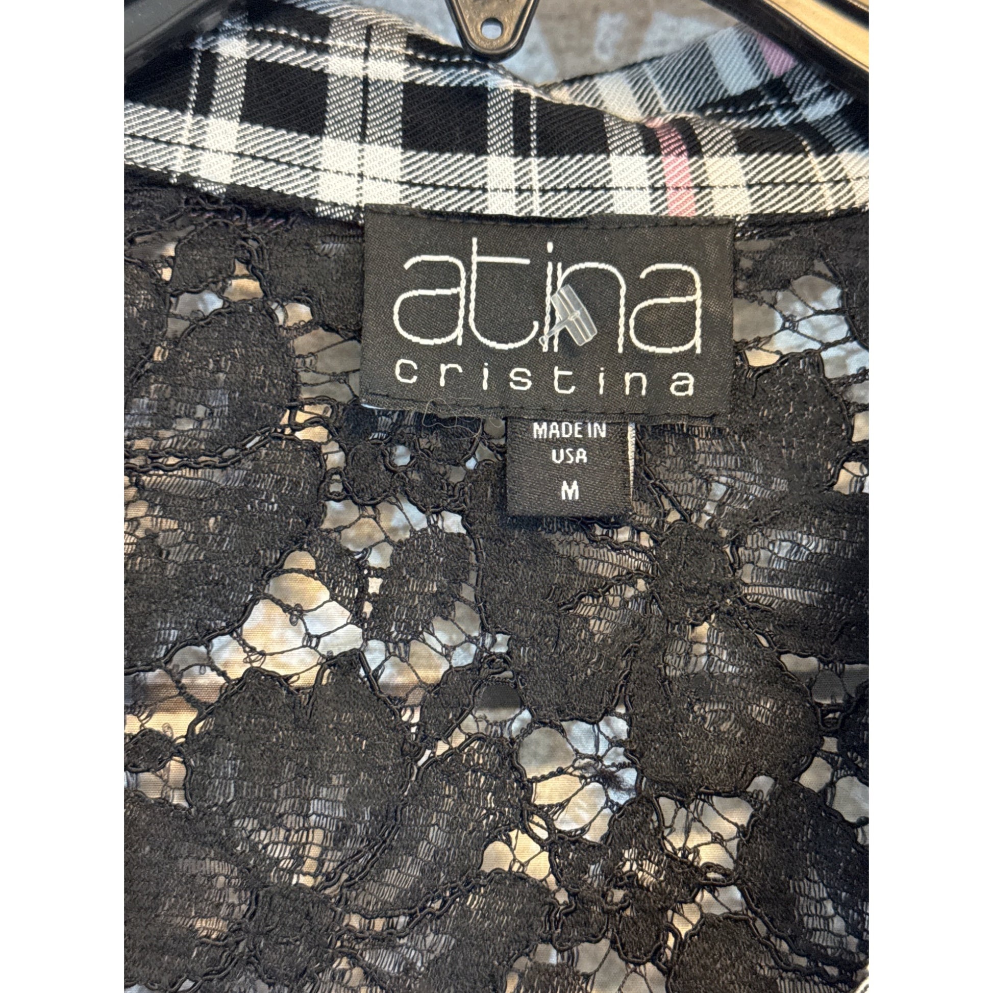 Atina Cristina Plaid Button-Up Shirt With Lace Detailing & 3/4 Sleeves Size M