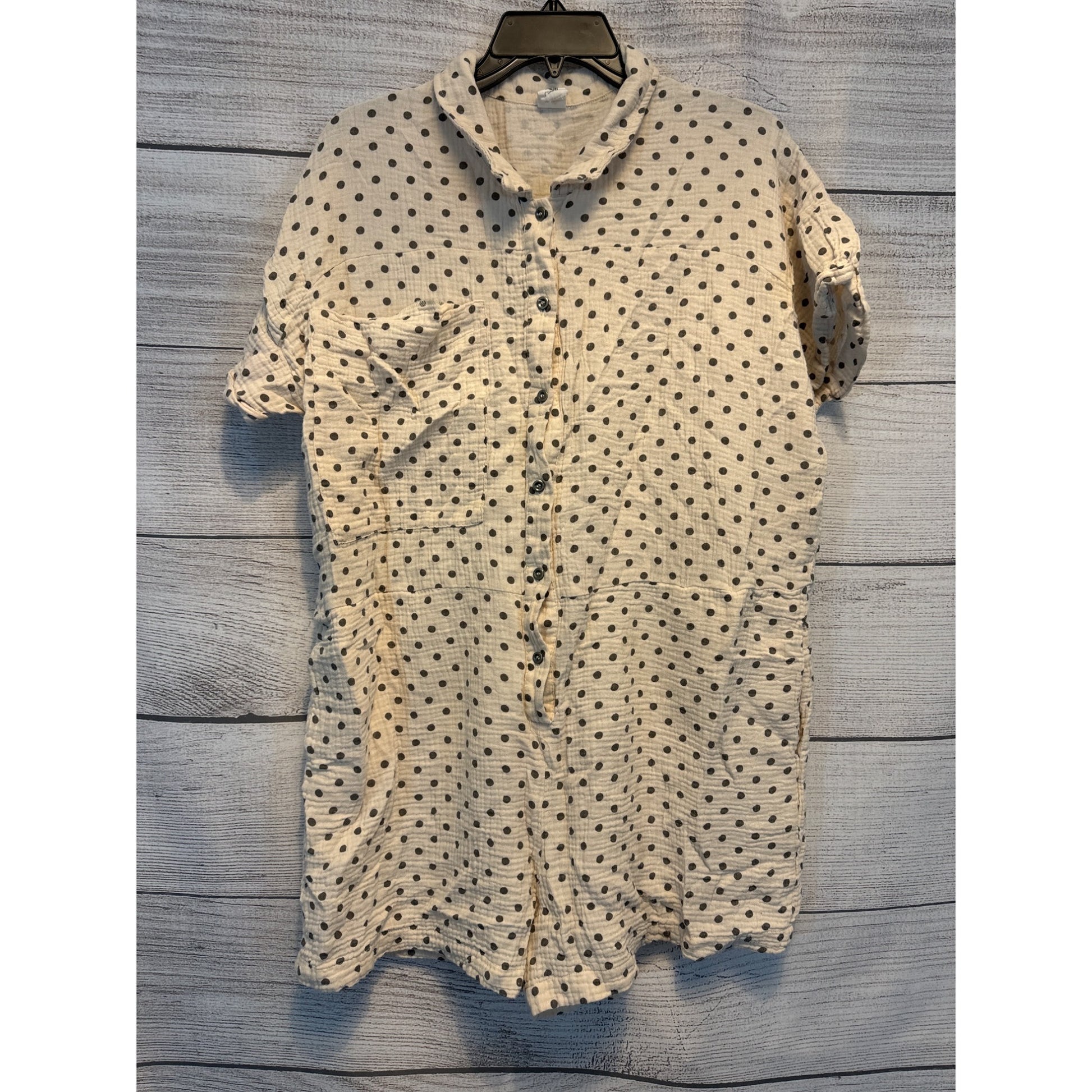 A trendy Flawless Play It Up Polka Dot Romper, medium size. This fashionable piece features a playful polka dot design, perfect for any casual or dressy occasion.