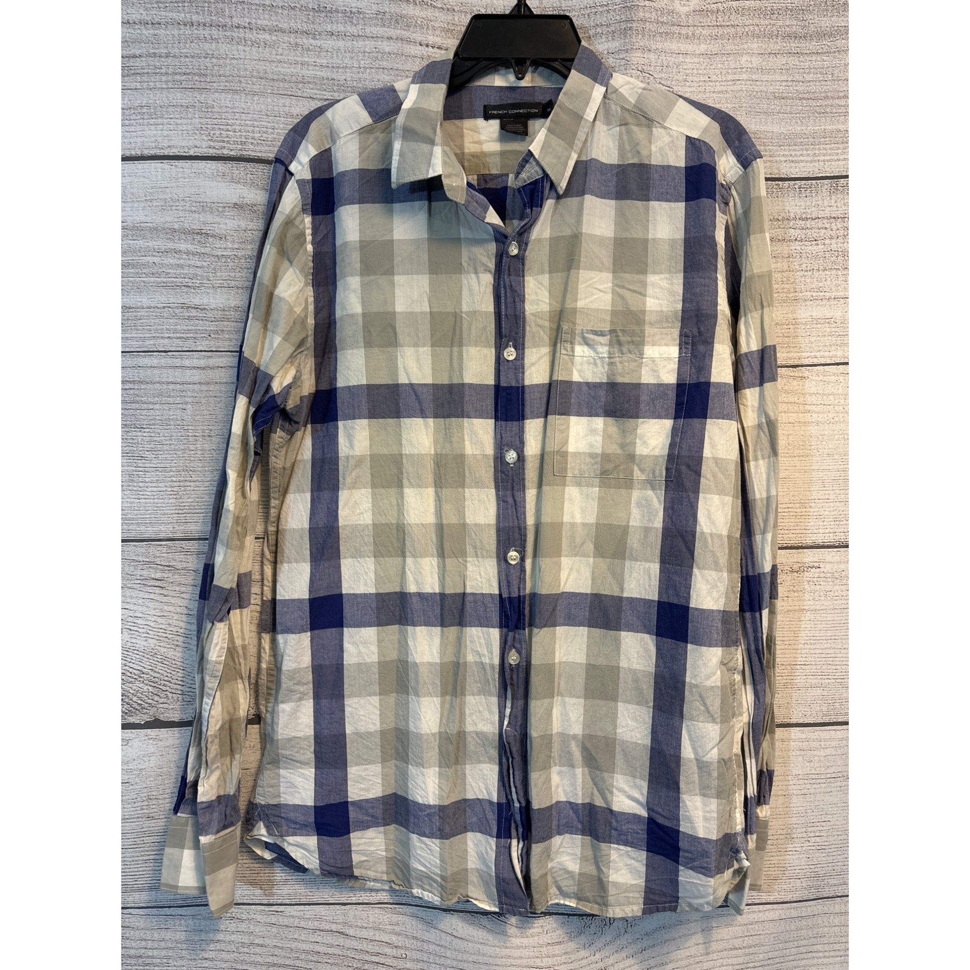This French Connection men's button down shirt in medium size features a stylish blue plaid pattern. Perfect for casual or business casual wear.