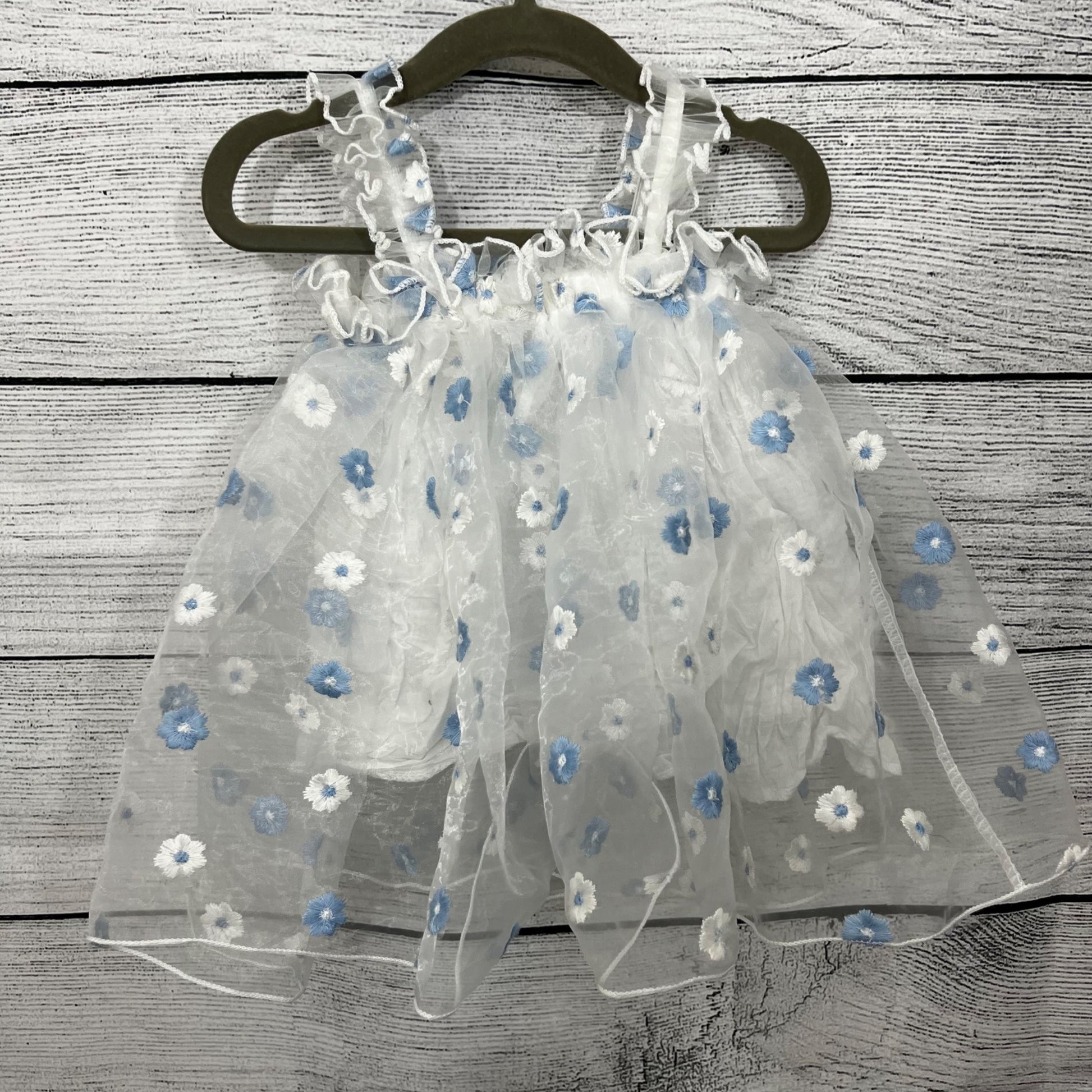Vintage Baby Dress White & Blue Floral Embroidered Sleeveless Ruffle Trim Tulle Overlay