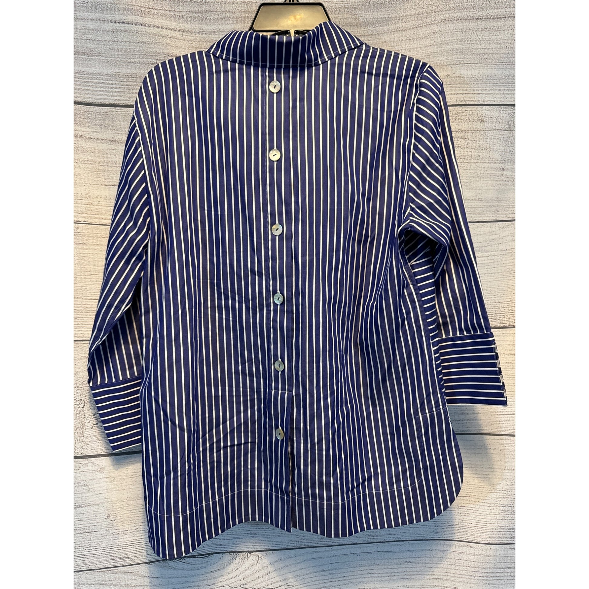 A marine blue striped NWOT Hinson Wu Aileen Pullover, size 10, made from polished cotton. Offers a stylish, casual look with an elegant touch.