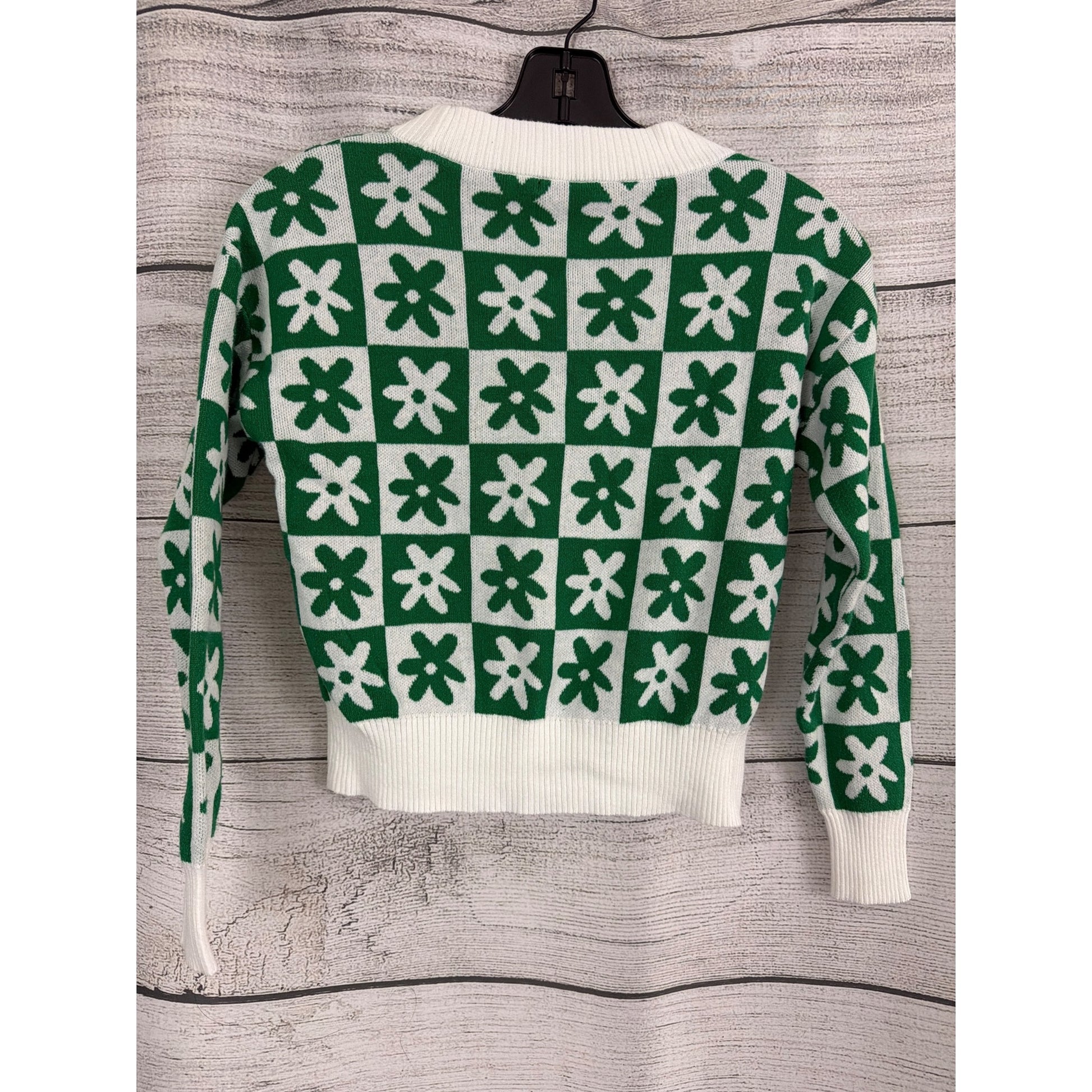 NWOT Nikka K Green & White Floral Checkered Knit Cropped Cardigan XS
