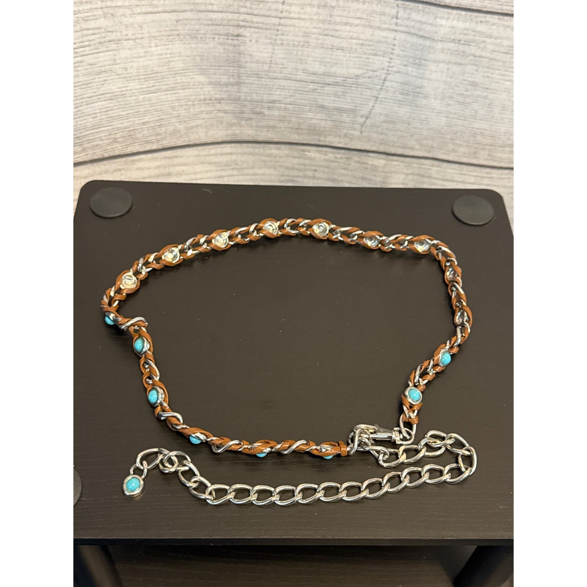 Adorn yourself with this belt that screams, "I'm stylish and I know it!" The turquoise accents pop against the silver and brown leather, like a fashion-forward cowboy at a rock concert. Adjustable chain ensures a fit as perfect as that last slice of pie you shouldn't have eaten.