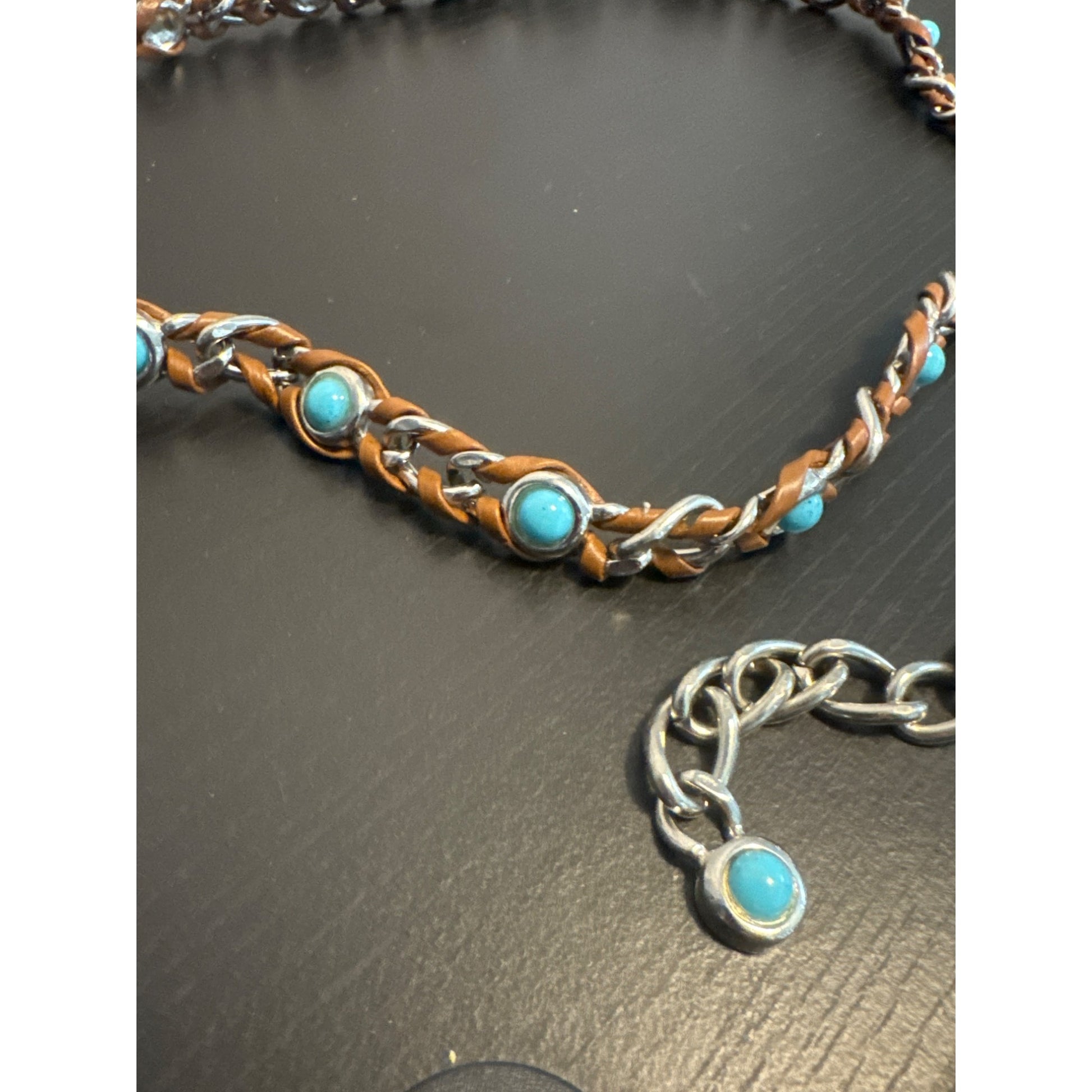 Vintage Silver & Brown Leather Belt With Turquoise Accents