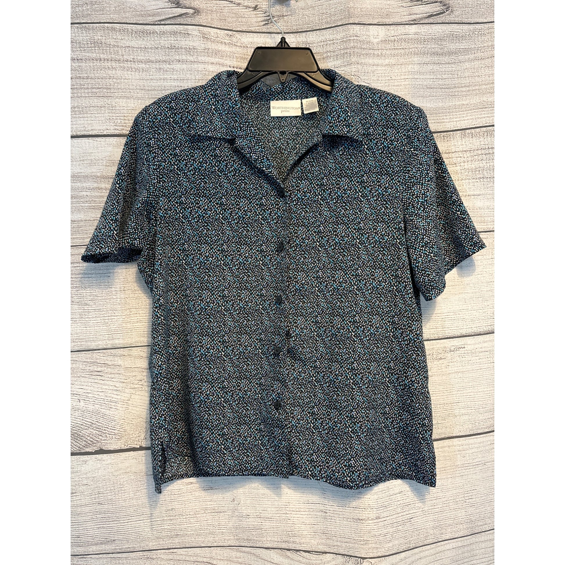 This Worthington Petite short-sleeve shirt features a playful black and blue speckle print, because who said polka dots should have all the fun?